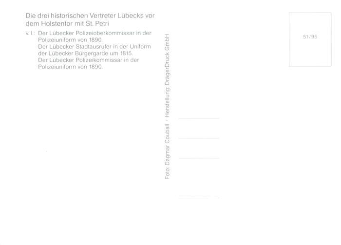 73945068 LueBECK CITY Die 3 historischen Vertreter Luebecks vor dem Holstentor mit St. Petri Kirche postalisch nicht gelaufen Erhaltung siehe scans [FriedD77] Frie Katcode 11110001003000