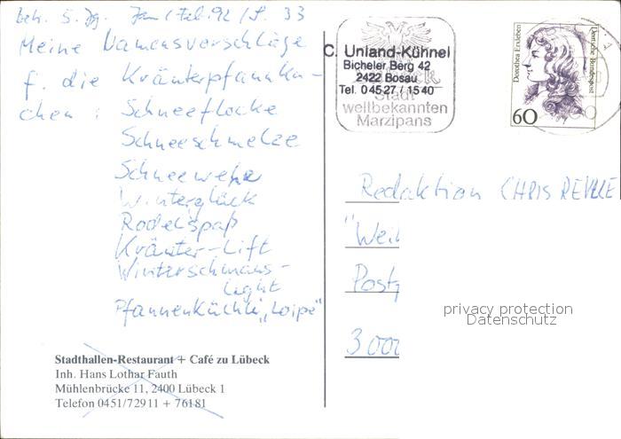 72465644 alte Postkarte LueBECK CITY Stadthallen Restaurant Cafe postalisch gelaufen Erhaltung siehe scans KatCode: 11110001003000