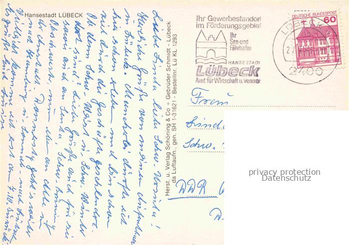 74022566 LueBECK CITY Stadtpanorama Hafenstadt postalisch gelaufen Fliegeraufnahme Erhaltung siehe scans [FriedD77] Fliegeraufnahme alte Postkarte Frie Katcode 11110001003000
