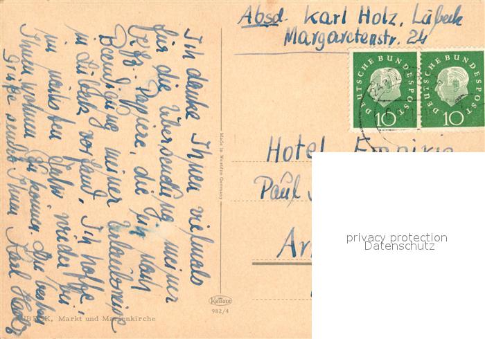 73313723 alte Postkarte Luebeck Marktplatz Marienkirche postalisch gelaufen Erhaltung siehe scans [LiesaD40] KatCode: 11110001003000
