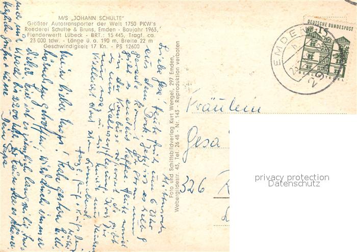 73094965 alte Postkarte Luebeck MS Johann Schulte postalisch gelaufen Erhaltung siehe scans [KathaD81] KatCode: 11110001003000