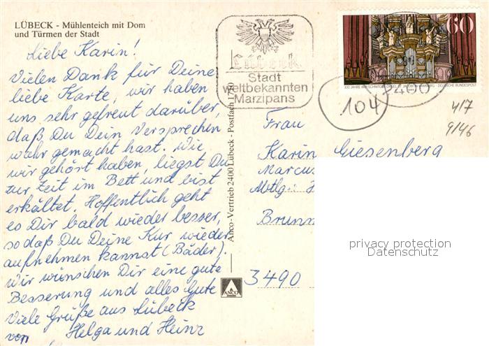 73216515 alte Postkarte Luebeck Muehlenteich mit Dom und Tuermen der Stadt postalisch gelaufen Erhaltung siehe scans [FriedD77] KatCode: 11110001003000