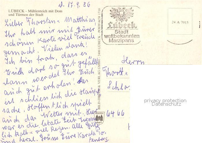 73217158 alte Postkarte Luebeck Muehlenteich mit Dom und Tuermen der Stadt postalisch gelaufen Erhaltung siehe scans [FriedD77] KatCode: 11110001003000