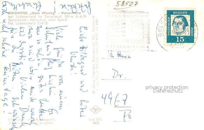 73761761 alte Postkarte Luedenscheid Berghotel Haus Wissing Homertturm postalisch gelaufen Fliegeraufnahme Erhaltung siehe scans [FriedD77] KatCode: 11110005962032