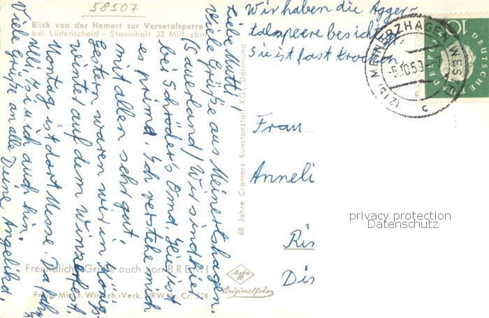 73764141 alte Postkarte Luedenscheid Blick von der Homert zur Versetalsperre postalisch gelaufen Erhaltung siehe scans [WerneD78] KatCode: 11110005962032