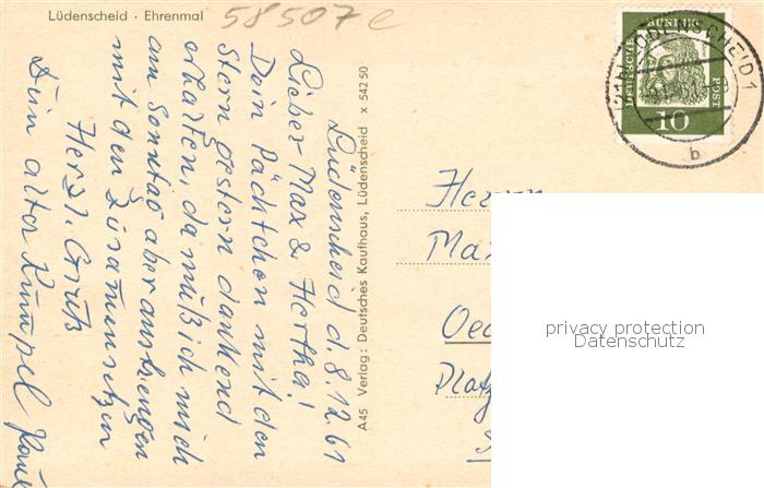 73757741 alte Postkarte Luedenscheid Ehrenmal postalisch gelaufen Erhaltung siehe scans [LiesaD40] KatCode: 11110005962032
