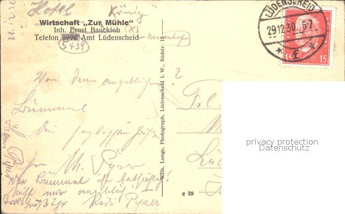 31728551 alte Postkarte Luedenscheid Wirtschaft zur Muehle postalisch gelaufen Erhaltung siehe scans KatCode: 11110005962032