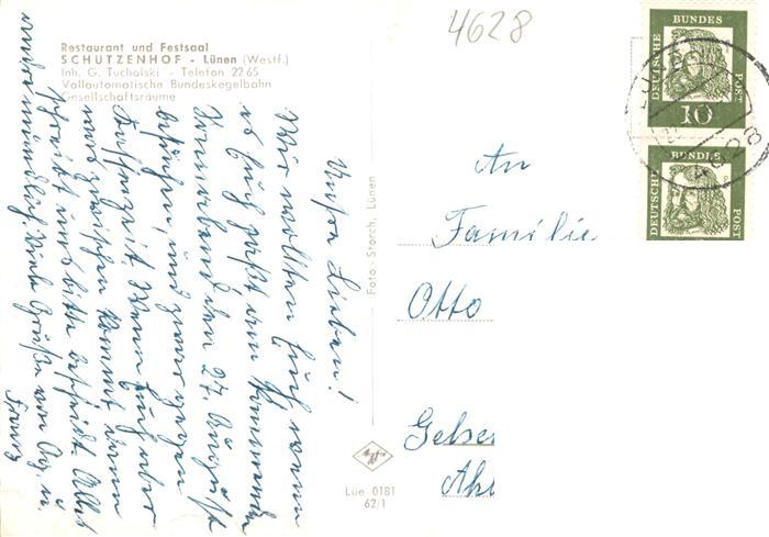 73869814 Luenen UNNA NRW Restaurant Festsaal Schuetzenhof Kegelbahn postalisch gelaufen Erhaltung siehe scans [FriedD77] alte Postkarte Frie Katcode 11110005978024
