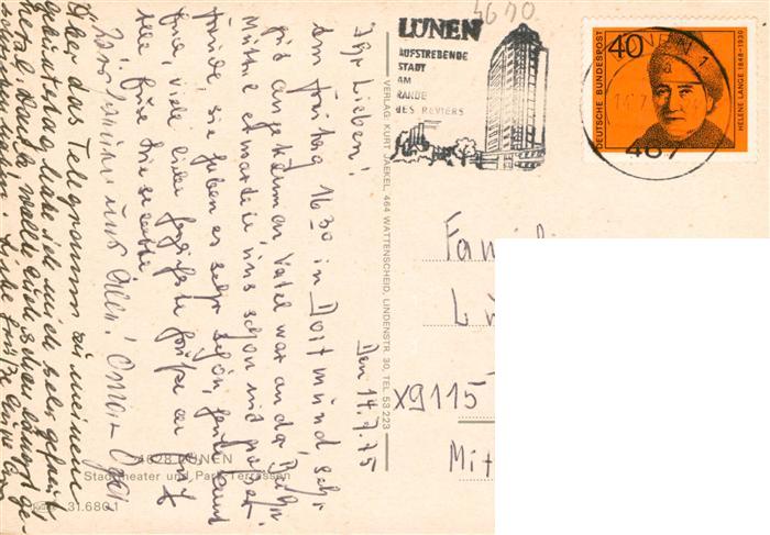 73936321 Luenen UNNA NRW Stadttheater und Parkterrassen postalisch gelaufen Erhaltung siehe scans [WerneD78] alte Postkarte Wern Katcode 11110005978024