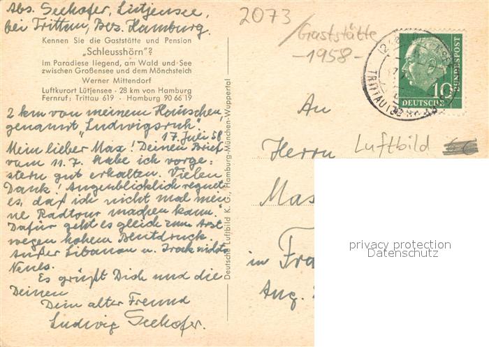 73714225 alte Postkarte Luetjensee Fliegeraufnahme Gaststaette Schleusshoern postalisch gelaufen Erhaltung siehe scans [LiesaD40] KatCode: 11110001062045