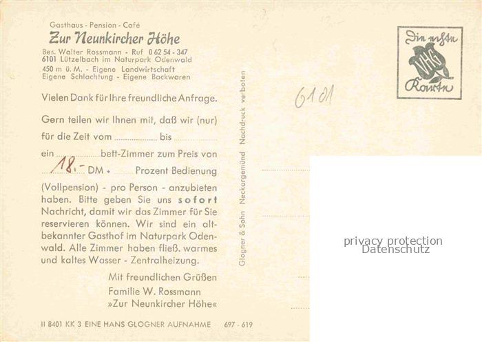74043446 Luetzelbach Odenwald Hessen Gasthaus Pension Café Zur Neunkircher Hoehe Gastraum Garten Viehweide postalisch nicht gelaufen Erhaltung siehe scans [FriedD77] KatCode: 11110006437010