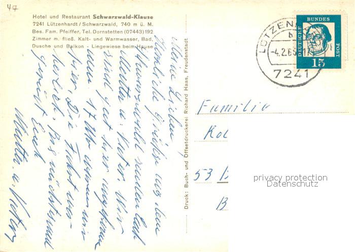 73645047 alte Postkarte Luetzenhardt Hotel Restaurant Schwarzwald Klause postalisch gelaufen Erhaltung siehe scans [WerneD78] KatCode: 11110008237074