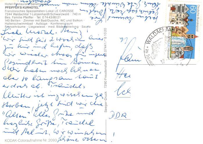 73946888 alte Postkarte Luetzenhardt Waldachtal BW Hotel Restaurant Sanatorium Pfeiffer’s Kurhotel postalisch gelaufen Erhaltung siehe scans [FriedD77] KatCode: 11110008237074