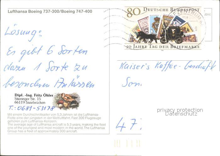 alte Postkarte Lufthansa Boeing 737-300 Boeing 747-400 postalisch gelaufen Erhaltung siehe scans