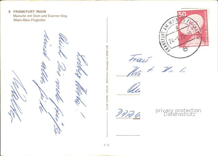 alte Postkarte Lufthansa Rhein-Main Flughafen Mainufer Dom Eiserner Steg postalisch gelaufen Erhaltung siehe scans