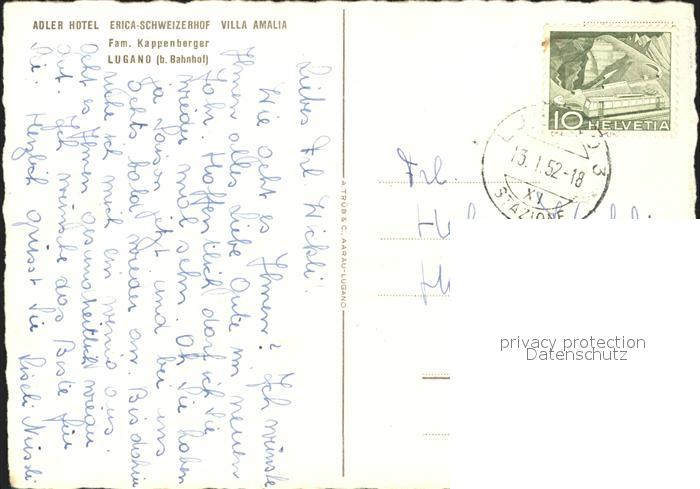 11643955 alte Postkarte Lugano TI Adler Hotel Erica Schweizerhof Villa Amalia postalisch gelaufen Erhaltung siehe scans KatCode: 11470210665262
