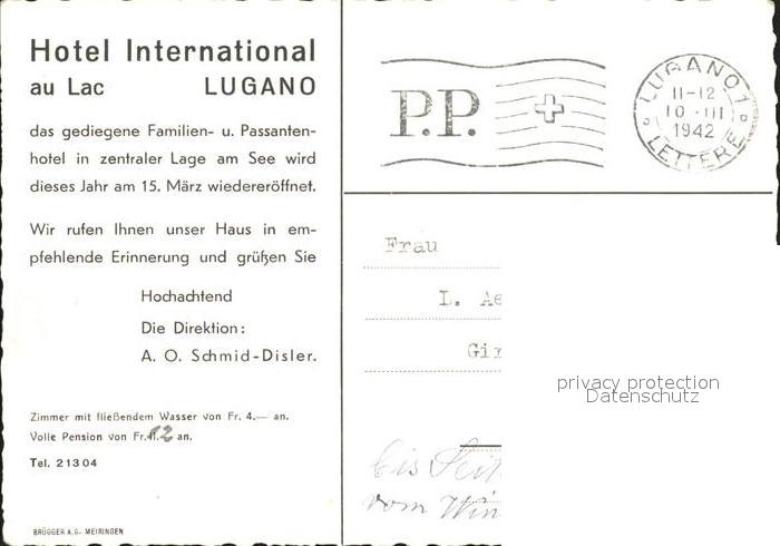11637023 alte Postkarte Lugano TI Hotel International au Lac postalisch gelaufen Erhaltung siehe scans KatCode: 11470210665262