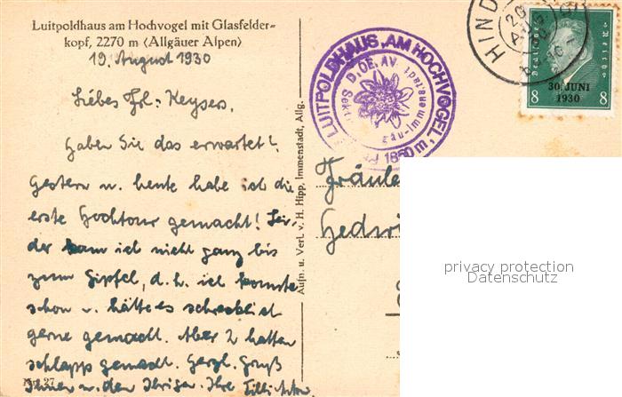 73360097 alte Postkarte Luitpoldhaus am Hochvogel mit Glasfelderkopft postalisch gelaufen Erhaltung siehe scans [LiesaD40] KatCode: 11110009780123