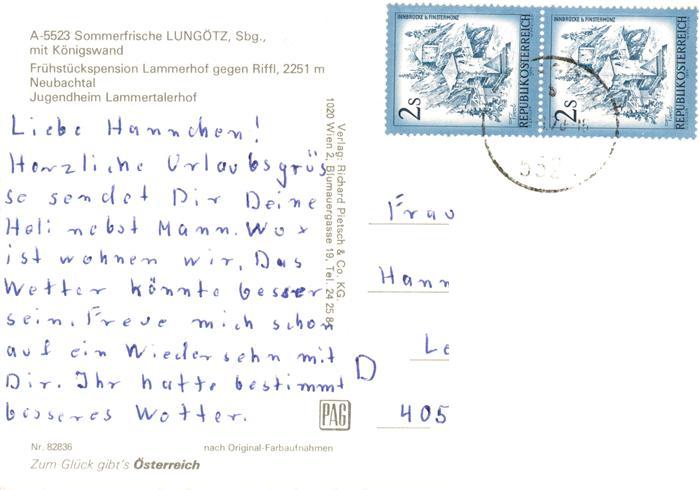 73900779 alte Postkarte Lungoetz Annaberg Lammertal AT Panorama mit Koenigswand Pension Lammerhof mit Riffl im Neubachtal postalisch gelaufen Erhaltung siehe scans [WerneD78] KatCode: 11390323050203
