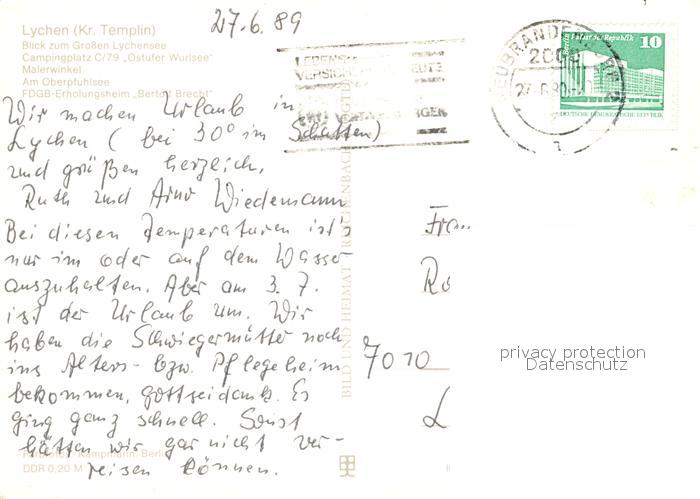 72972801 alte Postkarte Lychen Grosser Lychensee Campingplatz Malerwinkel Oberpfuhlsee FDGB Erholungsheim postalisch gelaufen Erhaltung siehe scans [FriedD77] KatCode: 11110012073384