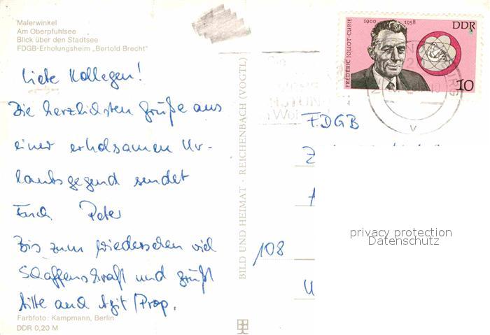 72666006 alte Postkarte Lychen Malerwinkel Am Oberpfuhlsee Stadtsee FDGB Erholungsheim Bertold Brecht postalisch gelaufen Erhaltung siehe scans [WerneD78] KatCode: 11110012073384
