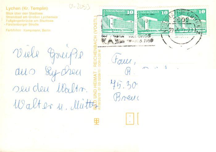 73947281 alte Postkarte Lychen Stadtsee Strandbad Fussgaengerbruecke Fuerstenberger Strasse postalisch gelaufen Erhaltung siehe scans [WerneD78] KatCode: 11110012073384