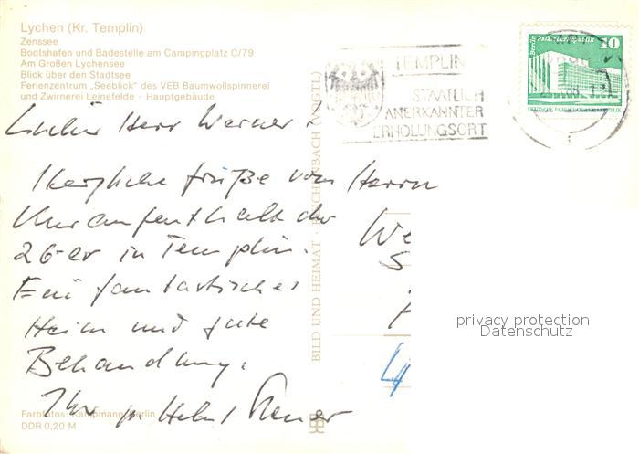 73148429 alte Postkarte Lychen Zenssee Bootshafen Badestelle Campingplatz Grosser Lychensee Stadtsee Ferienzentrum postalisch gelaufen Erhaltung siehe scans [FriedD77] KatCode: 11110012073384