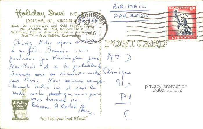 71964804 old postcard Lynchburg Virginia Holiday Inn postalisch gelaufen Erhaltung siehe scans KatCode: 14140490000000