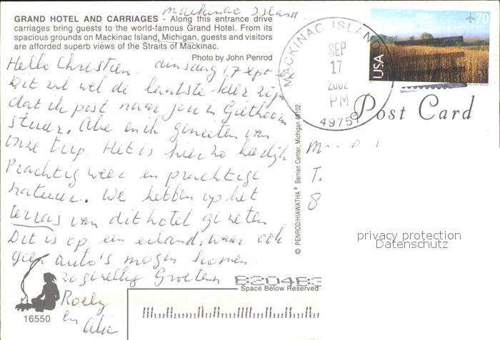 71859650 old postcard Mackinac Island Grand Hotel Pferdekutsche postalisch gelaufen Erhaltung siehe scans KatCode: 14140240000000