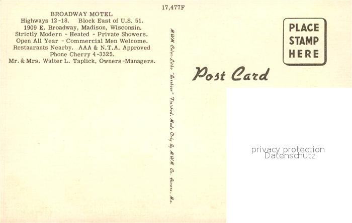 73153931 Madison Wisconsin Broadway Motel postalisch nicht gelaufen Erhaltung siehe scans [LiesaD40] KatCode: 14140520000000