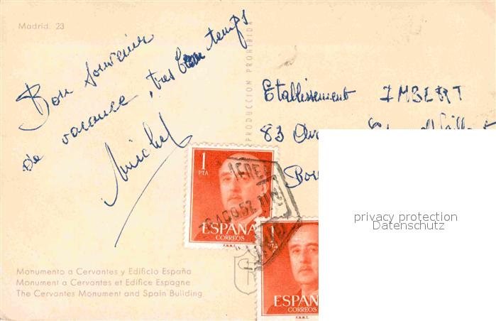 old postcard Madrid Spain Monumento a Cervantes y Edificio Espana postalisch gelaufen Erhaltung siehe scans [LiesaD40]