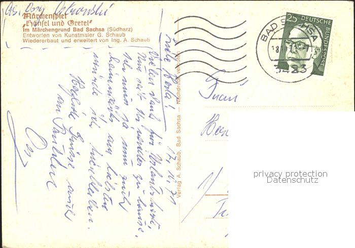 alte Postkarte Maerchen Sagen Haensel und Gretel Maerchengrund Bad Sachsa postalisch gelaufen Erhaltung siehe scans