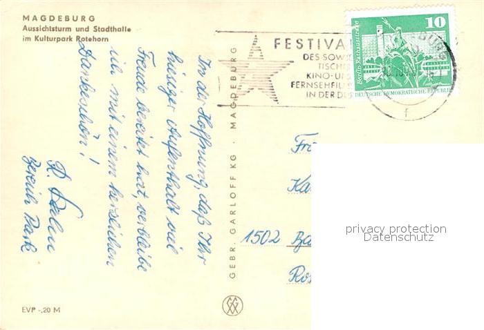 72986178 alte Postkarte Magdeburg Aussichtsturm Stadthalle Kulturpark Rotehorn postalisch gelaufen Erhaltung siehe scans [FriedD77] KatCode: 11110015003000