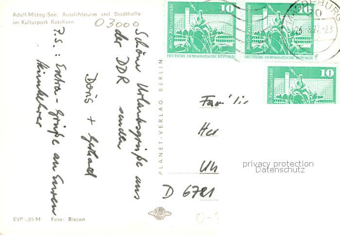 72941216 alte Postkarte MAGDEBURG CITY Adolf-Mittag See Aussichtsturm Stadthalle postalisch gelaufen Erhaltung siehe scans [NatalD47] KatCode: 11110015003000