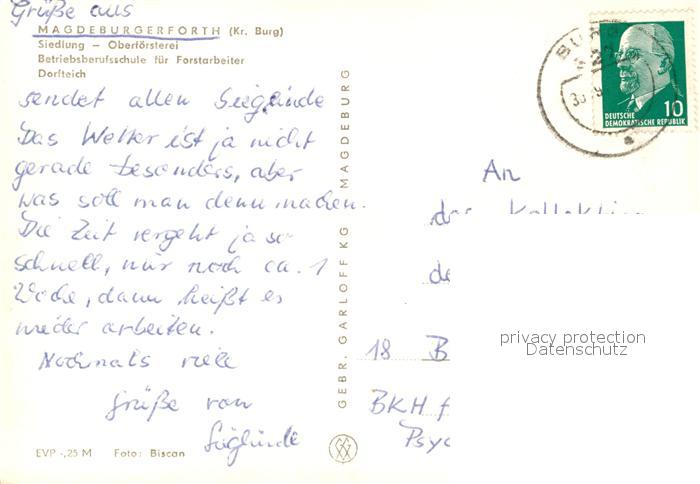 73100588 alte Postkarte Magdeburgerforth Siedlung Oberfoersterei Dorfteich Betriebsberufsschule Forstarbeiter postalisch gelaufen Erhaltung siehe scans [KathaD81] KatCode: 11110015086135