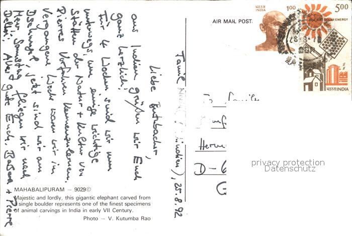 old postcard Mahabalipuram Elephant postalisch gelaufen Erhaltung siehe scans