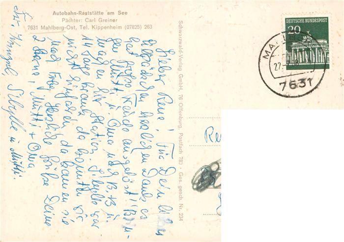73931508 alte Postkarte Mahlberg Baden Autobahn Raststaette am See postalisch gelaufen Erhaltung siehe scans [WerneD78] KatCode: 11110008317073