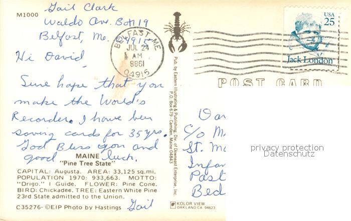 73060859 old postcard Maine Pine Tree State postalisch gelaufen Erhaltung siehe scans [WerneD78] KatCode: 14140340000000