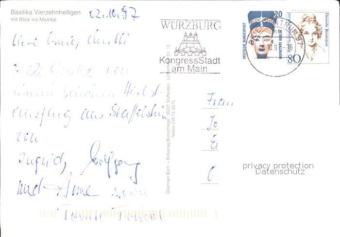 72374187 alte Postkarte Maintal Basilika Vierzehnheiligen Maintalblick Fliegeraufnahme postalisch gelaufen Erhaltung siehe scans KatCode: 11110006435019