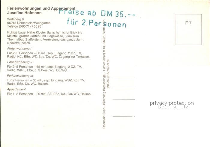 72304849 Maintal Ferienwohnung Hofmann Staffelberg Vierzehnheiligen Staffelstein Obermain Therme Kloster Banz postalisch nicht gelaufen Erhaltung siehe scans KatCode: 11110006435019