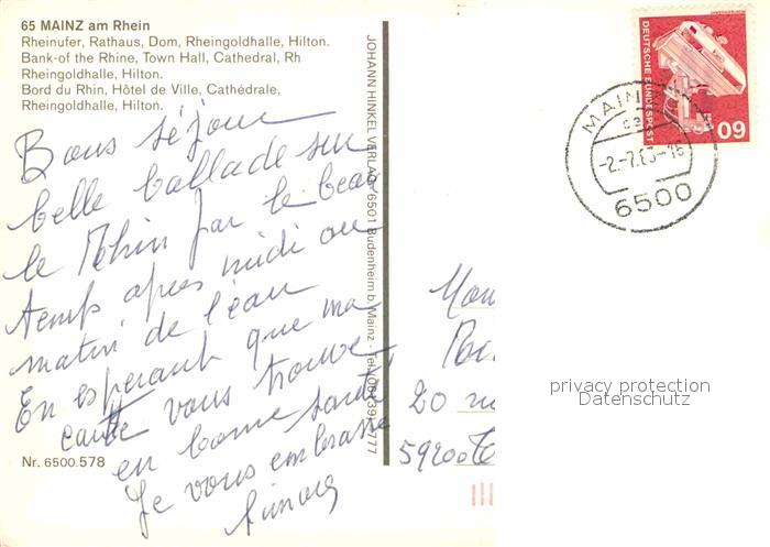 72616192 alte Postkarte Mainz Rhein Fahrgastschiff Rheinufer Rathaus Dom Rheingoldhalle Hilton postalisch gelaufen Erhaltung siehe scans [WerneD78] KatCode: 11110007315000