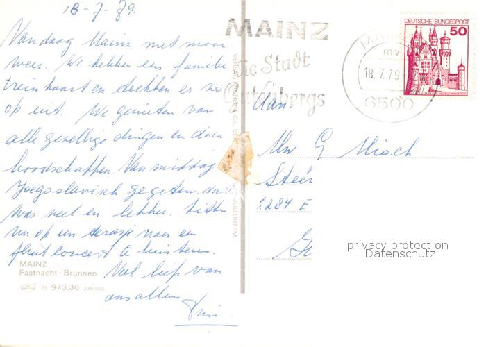 72935689 alte Postkarte Mainz Rhein Fastnachtbrunnen postalisch gelaufen Erhaltung siehe scans [FriedD77] KatCode: 11110007315000