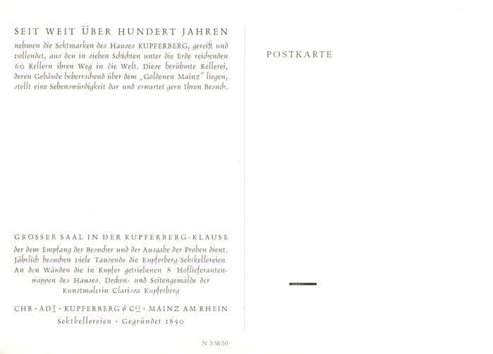 73875643 Mainz Rhein Grosser Saal in der Kupferberg Klause der Sektkellerei Kupferberg postalisch nicht gelaufen Erhaltung siehe scans [WerneD78] KatCode: 11110007315000