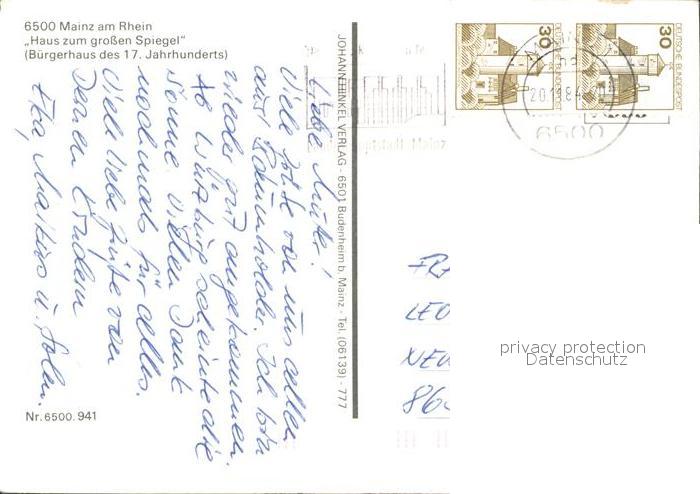 72510948 alte Postkarte Mainz Rhein Haus zum grossen Spiegel postalisch gelaufen Erhaltung siehe scans KatCode: 11110007315000