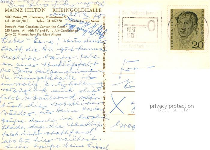 73835205 alte Postkarte Mainz Rhein Hilton Rheingoldhalle Rheinfaehre postalisch gelaufen Erhaltung siehe scans [FriedD77] KatCode: 11110007315000