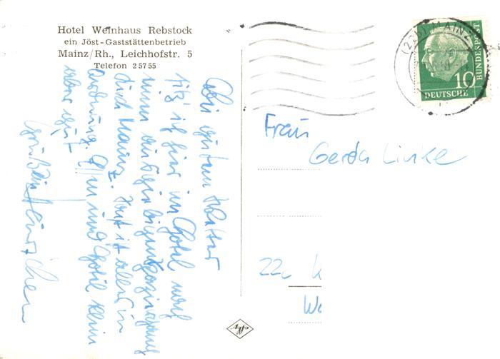 73887490 alte Postkarte Mainz Rhein Hotel Weinhaus Rebstock Restaurant postalisch gelaufen Erhaltung siehe scans [FriedD77] KatCode: 11110007315000