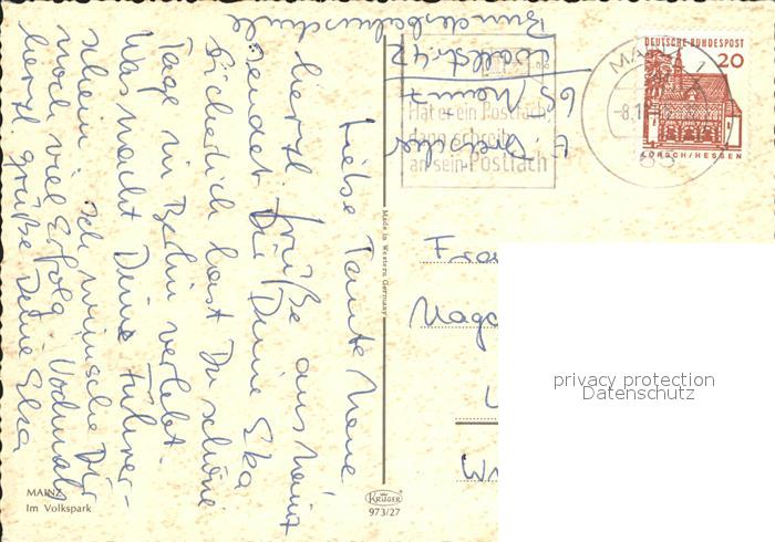 72157102 alte Postkarte Mainz Rhein Im Volkspark Brunnen Wasserspiele Hochhaus postalisch gelaufen Erhaltung siehe scans KatCode: 11110007315000