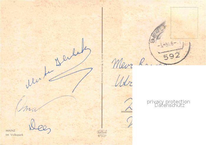 72824468 alte Postkarte Mainz Rhein Im Volkspark Wasserspiele Hochhaus postalisch gelaufen Erhaltung siehe scans [FriedD77] KatCode: 11110007315000