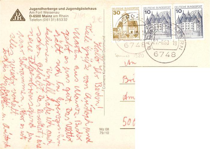 73875641 alte Postkarte Mainz Rhein Jugendherberge und Jugendgaestehaus Eingangshalle Gaestezimmer Maguntiumstube postalisch gelaufen Erhaltung siehe scans [WerneD78] KatCode: 11110007315000