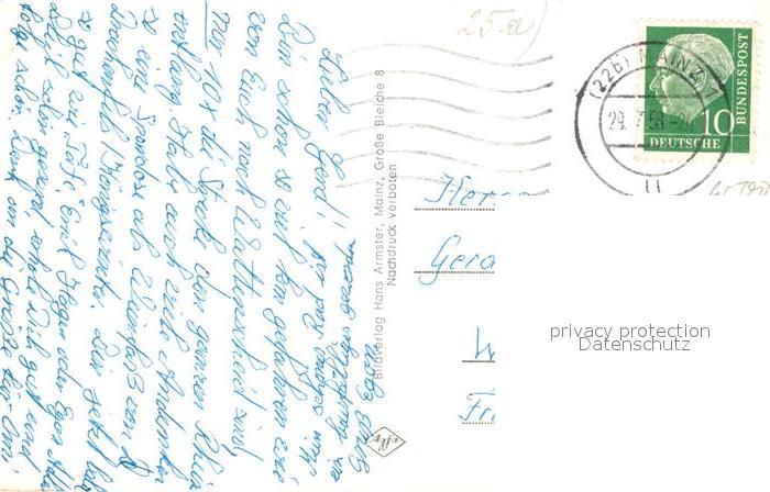 43350381 alte Postkarte Mainz Rhein Kirche Schloss Bahnhof Kaiserstrasse Neubrunnenplatz Grosse Bleiche Gutenberg Denkmal Statue postalisch gelaufen Erhaltung siehe scans [FriedD77] KatCode: 11110007315000